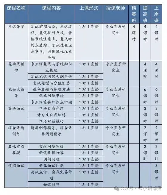 课程分为复试精英班、提高班、上岸班和复试协议班。