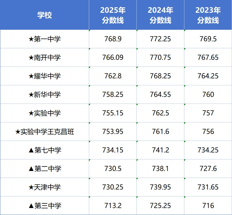 顶尖梯队(一中/南开/耀华):近4年分数线稳定在760-770分区间,2025年一中768.9分、南开766.09分,且对语数外小分有明确要求(如南开需语数外合计343.5分以上)。