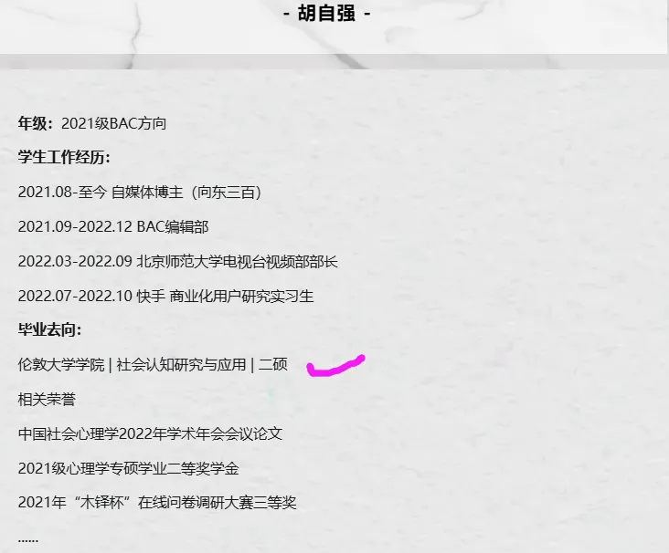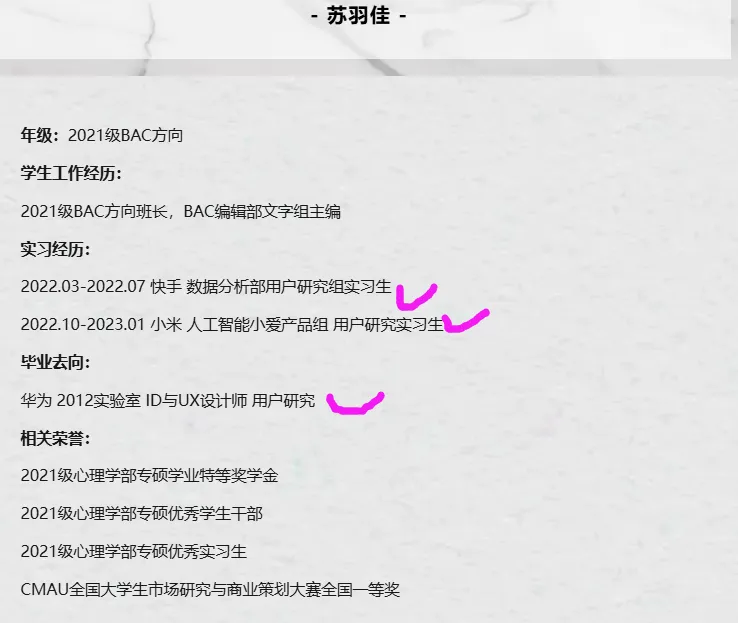 比如:2021年开始,BAC方向和抖音用户研究部门开启了校企合作系列研究项目。在方向负责人王芳老师、项目负责人李慧中老师,以及抖音相关业务负责人的联合指导下,2020级与2021级共8位同学作为团队成员开展了两期共三个阶段的项目研究。
