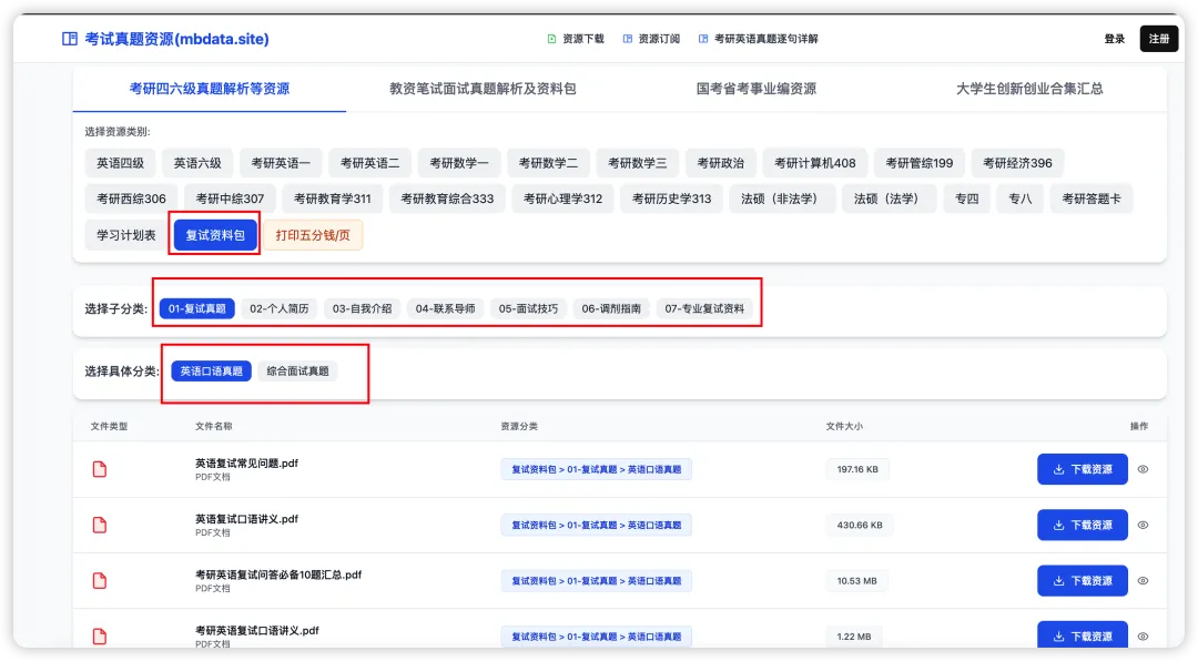 【建议收藏】考研复试资料合集来啦!!真题/口语/简历/联系导师/面试100问/调剂…等等(面包资料屋mbdata.site)