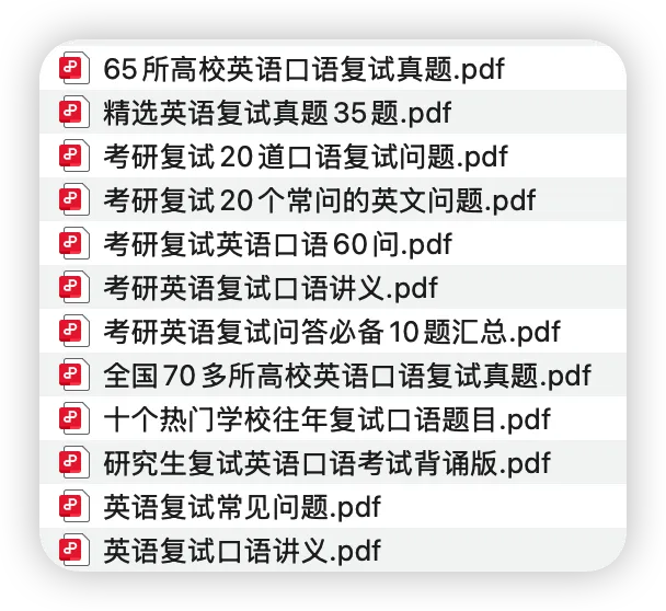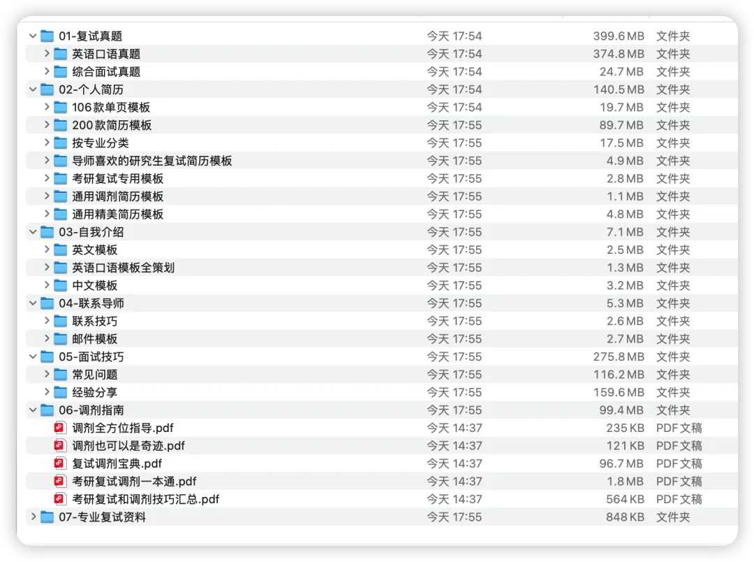 所以我把复试最常用的资料,直接按复试流程整理成一个合集:从真题到口语、从自我介绍到简历、从联系导师到面试高频问答、再到调剂指南——一套够用!
