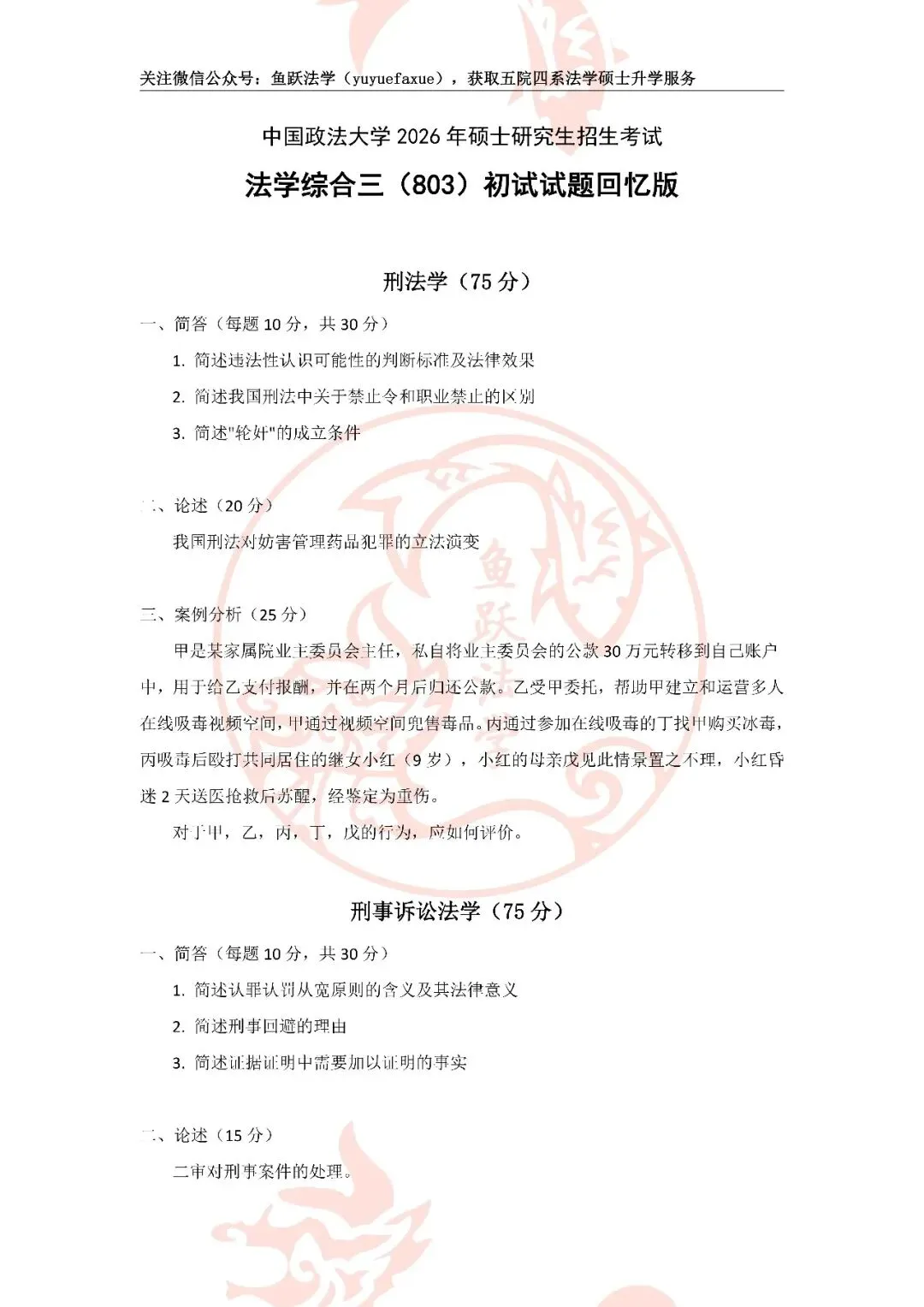 中国政法大学2026年法学综合三(803)试卷中,刑事诉讼法学部分共75分,与刑法学分值持平。从题型设置来看,采用“简答+论述+案例分析”的经典组合。与改革前相比,名词解释退出了历史舞台,可以看出新的考试模式意在降低记忆性试题的比重,侧重考查考生的综合运用能力。三种题型的分值分别为30分、15分、30分,既兼顾基础知识点的识记考查,又注重对考生综合应用与理论深度的检验。
