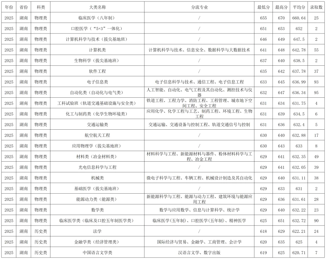 中南大学2025年在湖南本科批物理类录取分数线较高的专业:临床医学(八年制)655分、口腔医学(“5+3”一体化)651分、计算机科学与技术(拔尖基地班)646分、计算机类641分,最低的是临床医学类(临床及口腔五年制医学类)625分。