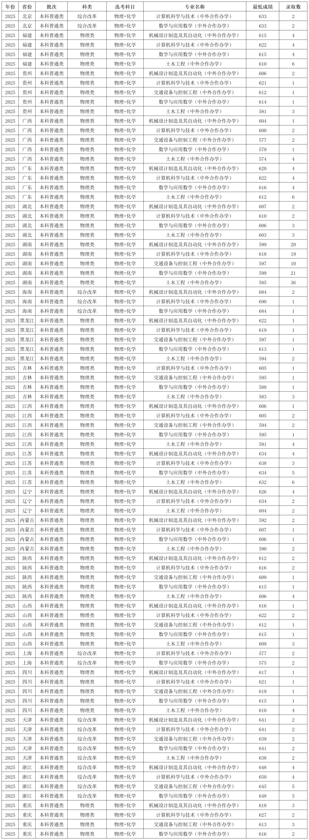 中南大学2025年中外合作办学在各省各专业录取分数线