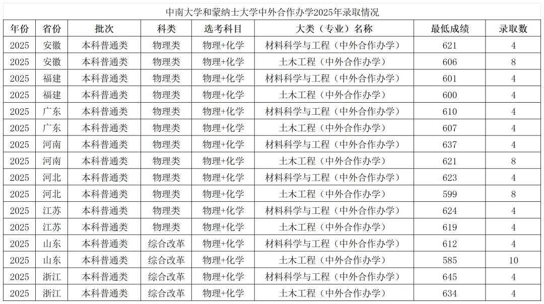 中南大学2025年和蒙纳士大学中外合作办学在各省各专业录取分数线