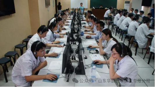 在人机对话考试中,考生只携带准考证等相关资料和身份证进场,分批次进入人机对话室进行测试,考试时,考生每人一台电脑,带着耳麦在电脑上进行操作答题。