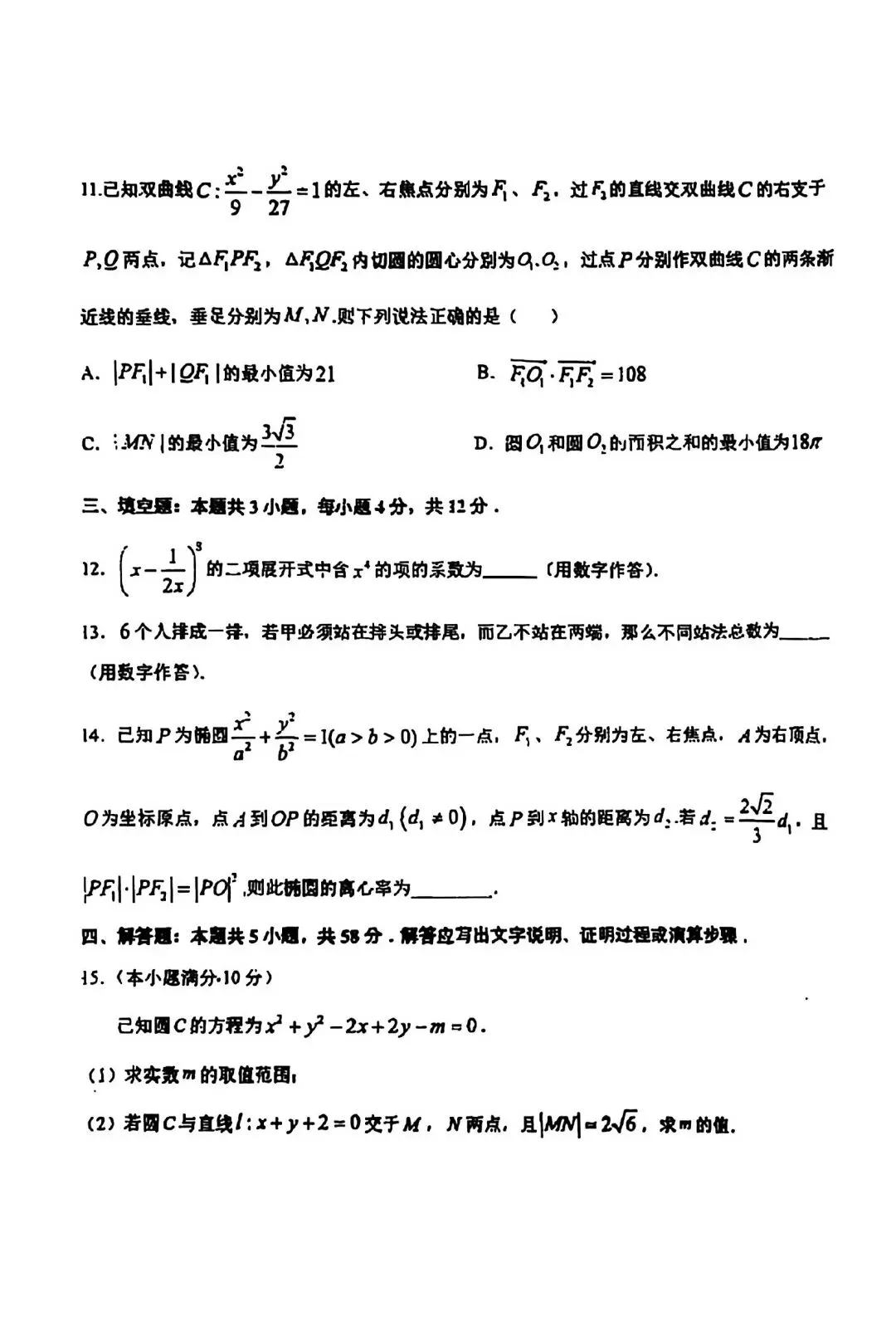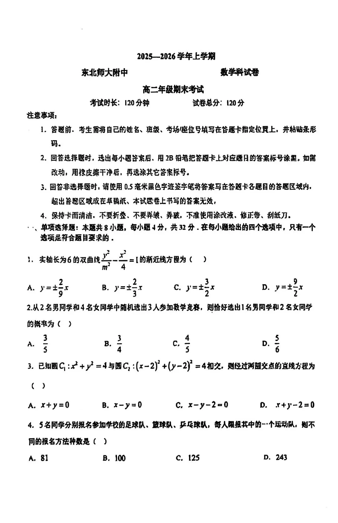 东北师大附中高二上期末考试题(无答案)