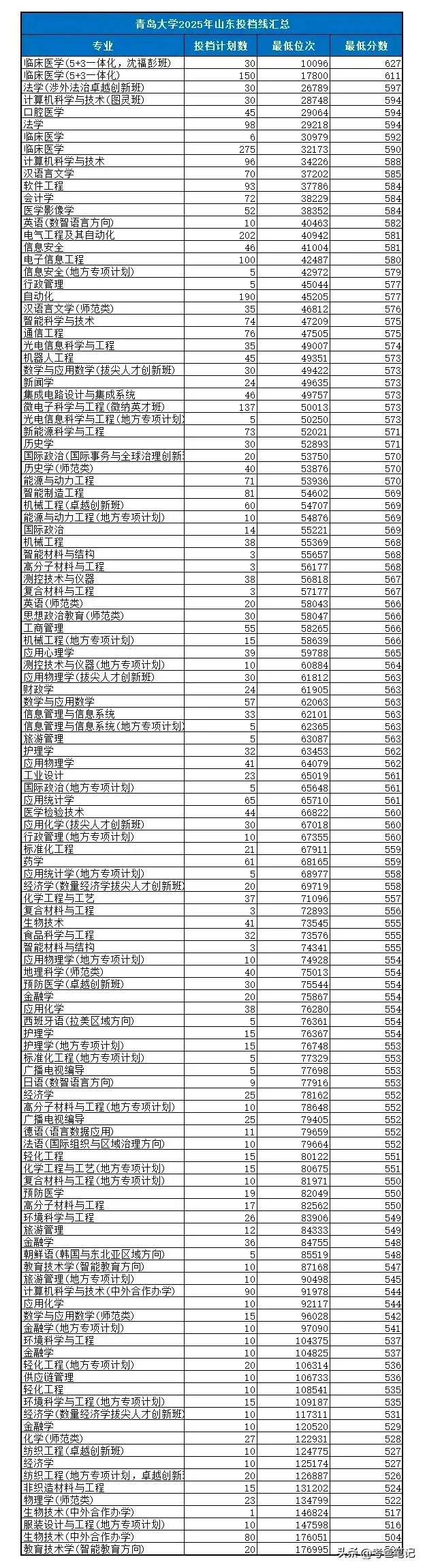 2025年青大各专业山东录取分数线如下:
