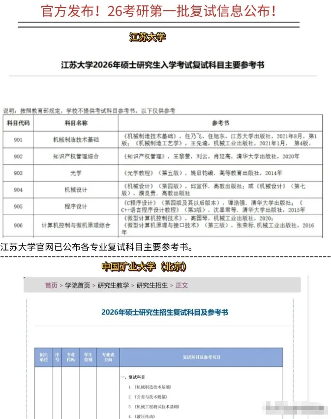 部分考生可能存在认知偏差,认为初试成绩将于二月底公布,复试备考无需急于一时。但实际情况是,多所院校已提前发布复试相关要求:江苏大学早在2025年9月便公布了复试参考书目,中国矿业大学(北京)更是于7月就发布复试科目信息,发布时间早于初试大纲;哈尔滨工业大学、上海财经大学等院校也在招生简章中同步更新了复试要求,部分专业指定参考书目多达十余本,当前若不启动复习,后续将难以完成备考任务。