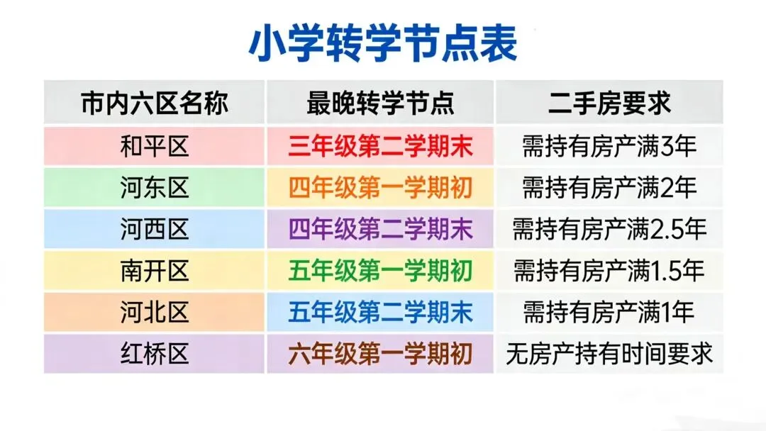 有房有户的家长,可直接为孩子办理回津转学,后续正常参加天津小升初考试即可。市内六区转学节点差异显著,二手房还有购房年限要求,家长务必提前核对: