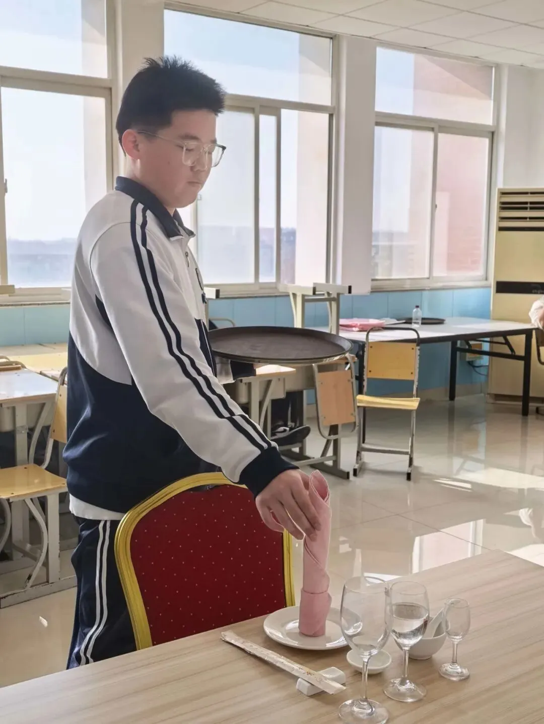 自此,孙久亿成了校园里最“拼”的身影之一。清晨的教室里,他是来的最早的一个,总能看到他捧着英语课本背诵专业词汇;实训室的模拟前厅和客房里,他反复练习托盘行走、中式铺床等实操技能,手腕酸了就揉一揉,摆台的间距不标准就拆了重来,直到动作流畅规范、分毫不差。