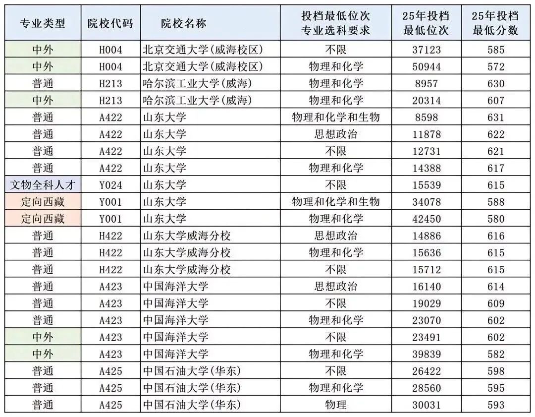 普通类中,山东大学2025年投档最低分为617分(不含定向西藏专业和文物全科人才培养),中国海洋大学2025年投档最低分为602分,中国石油大学(华东)2025年投档最低分为593分。