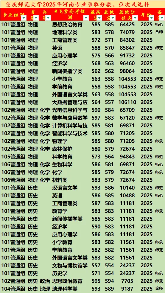 重庆师范大学2021-25年河南录取分数线、位次及选科