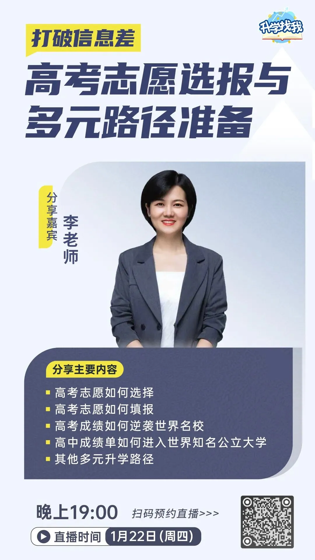 1月22日(周四)晚上19:00,资深升学规划老师将带来专场直播,破解高考升学信息差!