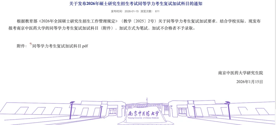 南京中医药大学在1月15日发布通知,明确了2026年硕士研究生招生考试中,同等学力考生复试加试的科目。加试方式为笔试,不合格者将不予录取。这对同等学力考生是一个重要的备考提醒。