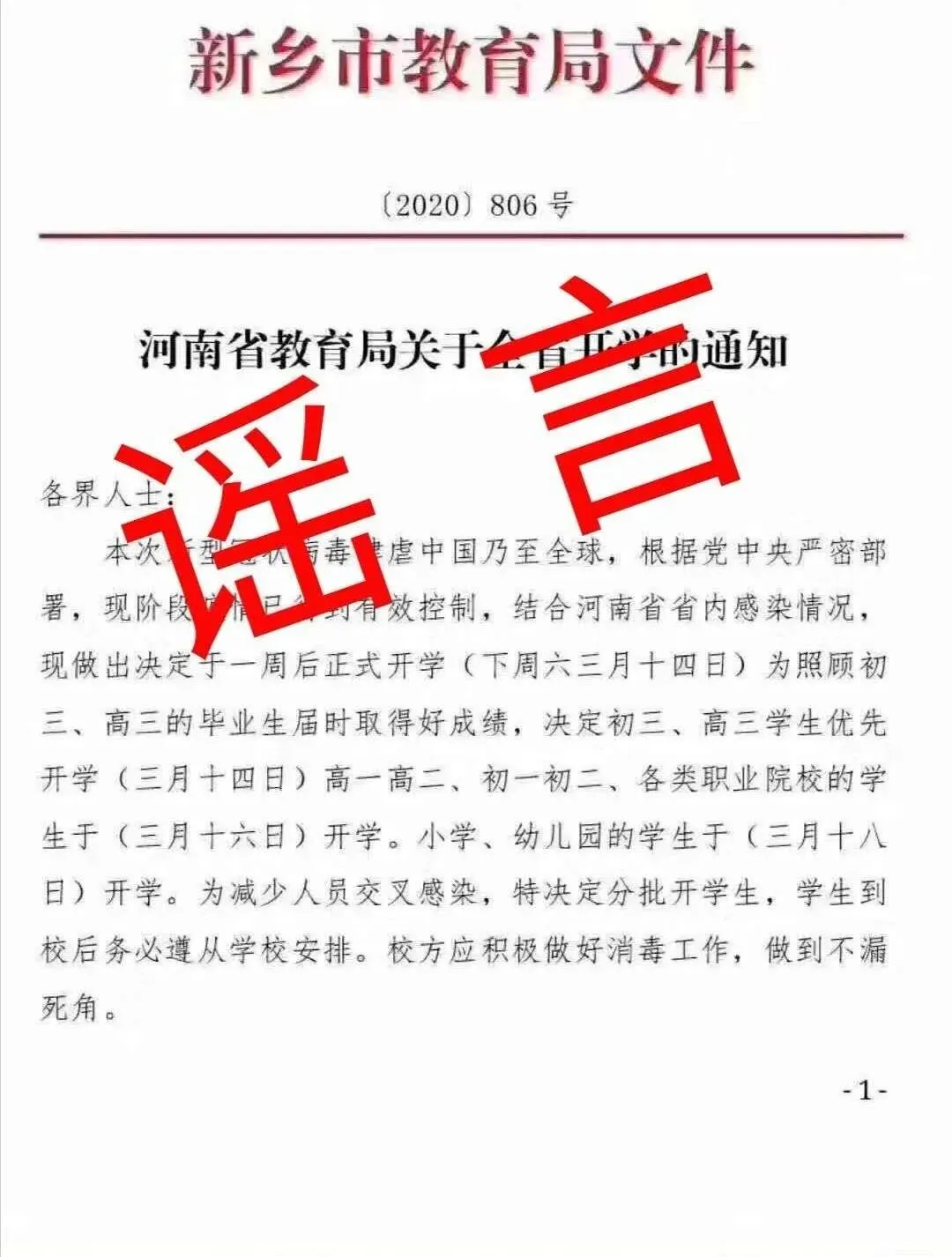3月9日,河南省教育厅官方微信公众号刊发推文《河南3月14日开学?1个至少27处错误的“假通知”你信了吗?小朱分分秒给你解读》,邀请厅办公室的“小朱同志”对最近一份在微信朋友圈、微信群里传得十分热闹所谓的“河南省教育厅关于全省开学的通知”进行了全面“审读”,“分分秒”指出了这份粗制滥造的“通知”的27处错误。