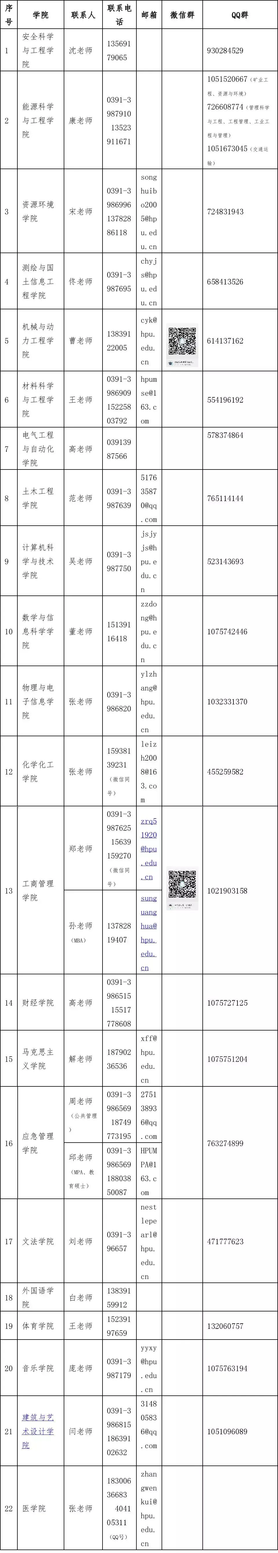 为贯彻落实上级部门关于做好新型冠状病毒感染的肺炎疫情防控工作的各项要求和工作部署,保障广大师生生命安全和身体健康,疫情期间,为了考生能及时、方便获取我校2020年研究生招生咨询信息,我校研招办及各招生学院开展线上招生咨询工作。我校研招办咨询电话0391-3987234、邮箱yanzhaoban219@hpu.edu.cn,各招生学院的招生咨询渠道公布如下,欢迎广大考生了解和咨询相关招生信息。