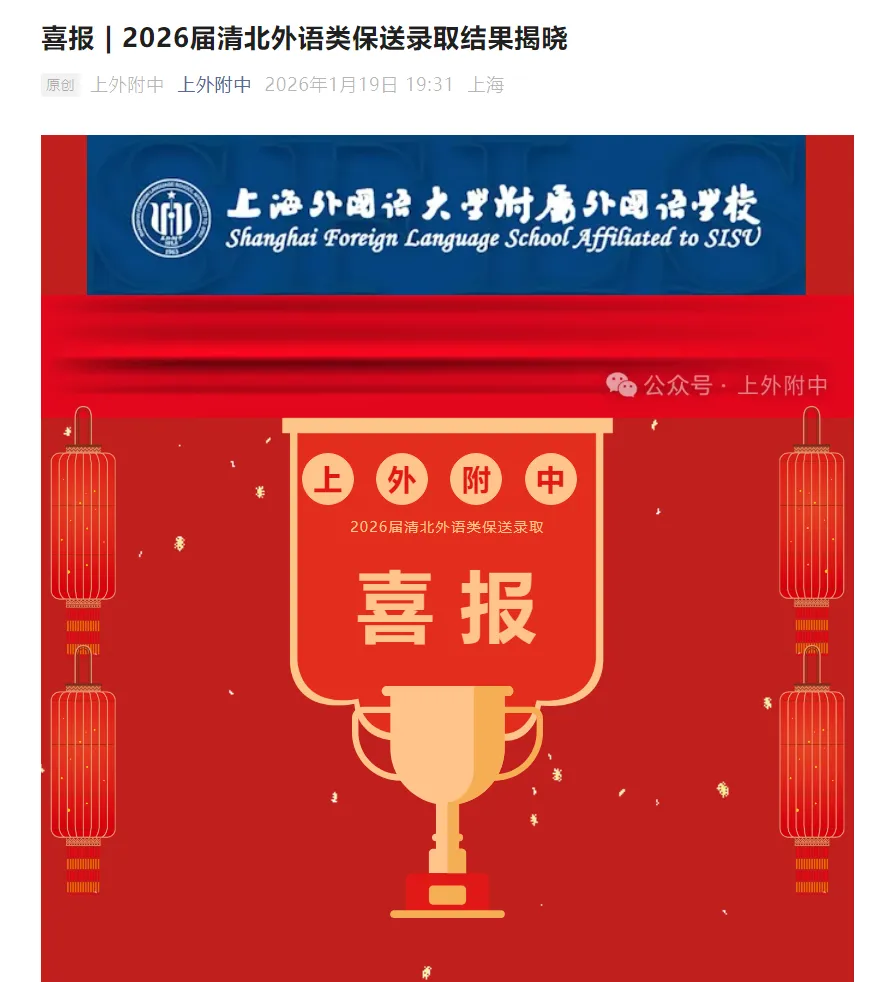 上外附中2026届清北保送再创佳绩!据昨晚发布的喜报,该校高三学生已获得北京大学预录取6人、清华大学预录取3人。此外,还有两位同学在高中阶段已提前锁定清北席位:徐亦捷同学于高一被北京大学数学英才班录取,胡杨同学于高二入选清华大学新领军计划。至此,该校本届244名高三学生中,已有11人提前被清华大学、北京大学录取。