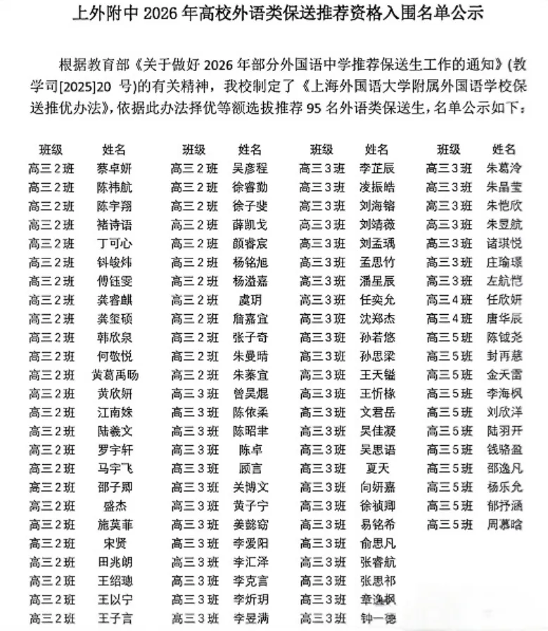 2026年共有118人获得外语类保送生资格,其中上外附中共有95人,浦外23人获得保送资格,各校保送生资格名单如下:根据教育部日前发布的《2026年普通高等学校部分特殊类型招生基本要求》,中学生学科奥林匹克竞赛国家集训队成员、部分外国语中学推荐优秀学生、公安英烈子女、退役运动员等人员具备高校保送资格。高校可以从上述人员中招收保送生,其中公安英烈子女按有关规定只能保送至公安类院校。