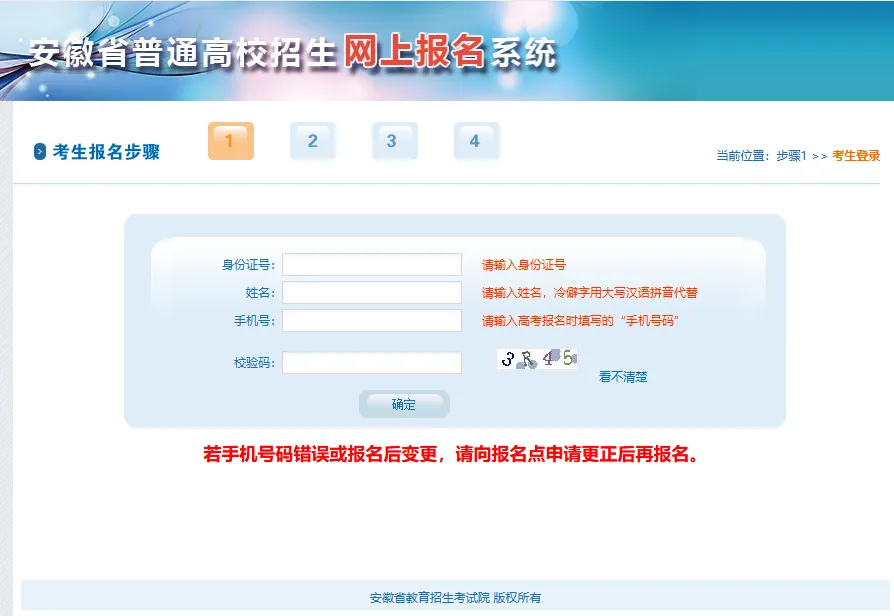 4.登录系统报名需要填写高考报名时填报的“手机号码”,若遗忘,可以到报名点、当地招生考试机构查询。如手机号码错误或报名后变更,请向报名点申请更正后再报名。