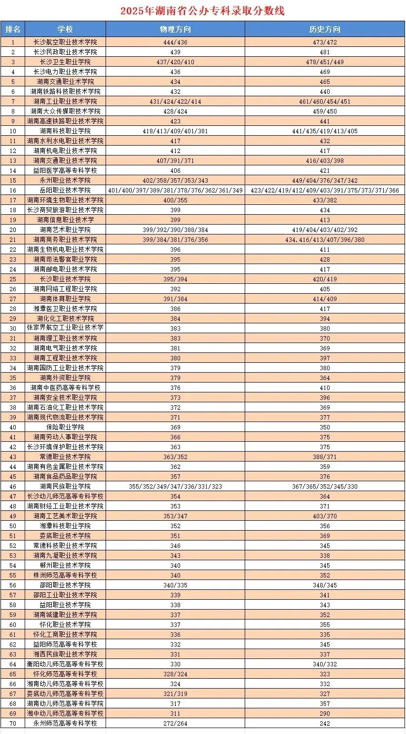 >2025年湖南省公办专科院校录取分数线