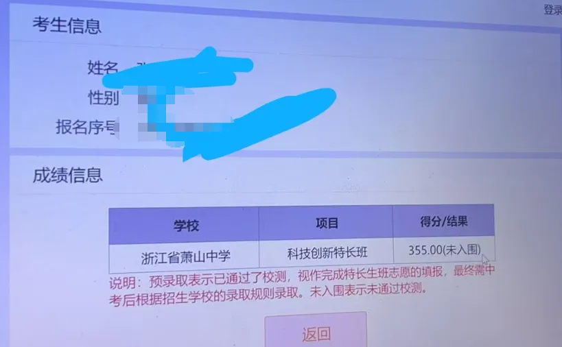 没入围根本不用担心!萧中拔尖班这只是中考的第一步,并不是终点。例如:也是355分,或仅有一分之差(353分)未入围的同学,或者差个两三分的同学,都会比较伤心,短时间内肯定难以调理过来的。不过转念一想,能够有这个成绩也是众多学霸中的佼佼者了,也是对自己实力的证明,后续五月科创班、中考正常发挥肯定能够取得更加优异的成绩!其余孩子感受了科创的难度后,也对“中考”第一次有了实感,对自己的水平也有了一个比较清晰的定位。相信在后续也会重拾信心,全心备战五月科创、签约以及中考。五月科创考不同于一月拔尖班,出成绩后并非直接录取,而是等待中考成绩出来,校考+中考各50%折算成综合分,从高到低录取92名学生。