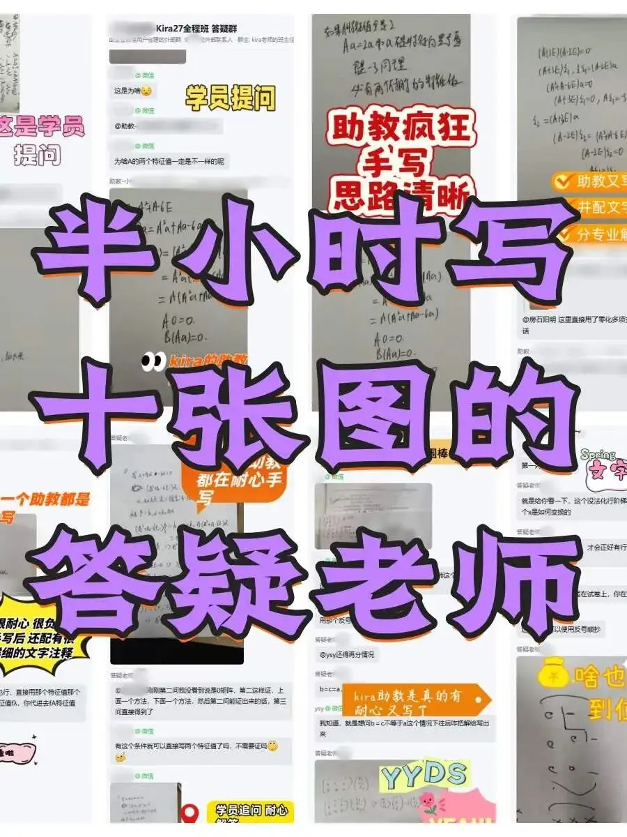 助教老师通过打字,语音,手写,编程和数学软件等方式的超详细超耐心答疑!(全程班每日4小时社群答疑,SVIP学员每日10小时超长答疑!答疑不限内容,不限次数!)