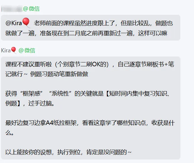针对每节课的内容,Kira老师都会亲自在通知群布置作业,并根据章节的不同特点提供复习建议,讲啥就练啥,完全配套!杜绝课和题脱节的问题,帮你把备考的每一天都安排的明明白白滴!