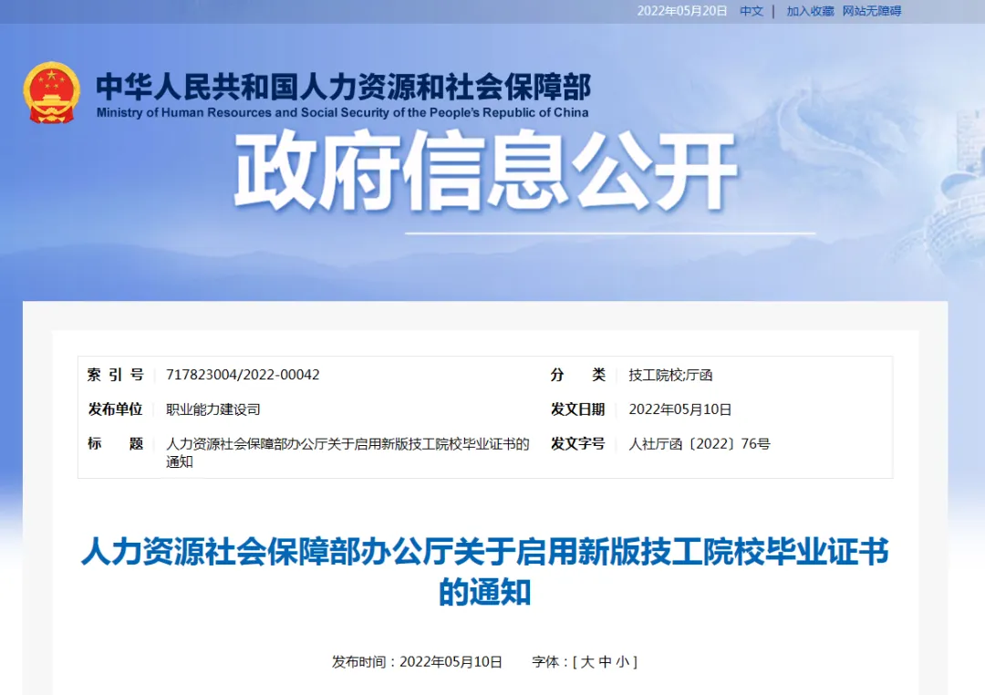 5月,国家人社部联合发改委、财政部,签发技工院校改革发展意见:改版技师学院、技工学校毕业证,要求相关毕业生信息(所学专业、培养层次、全日制等)与待遇等要在新版证书上明确显示。新版技工院校毕业证书将于2022年9月1日起正式启用。