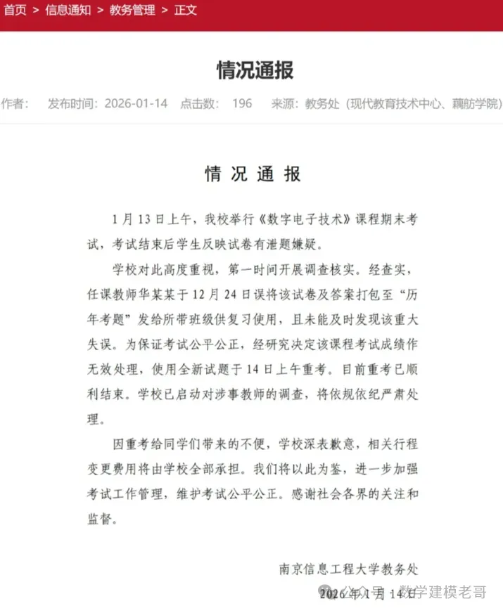 1月14日,有消息称南京信息工程大学期末考试泄题,学生被召回重考。昨日,南京信息工程大学教务处发布通报如下: