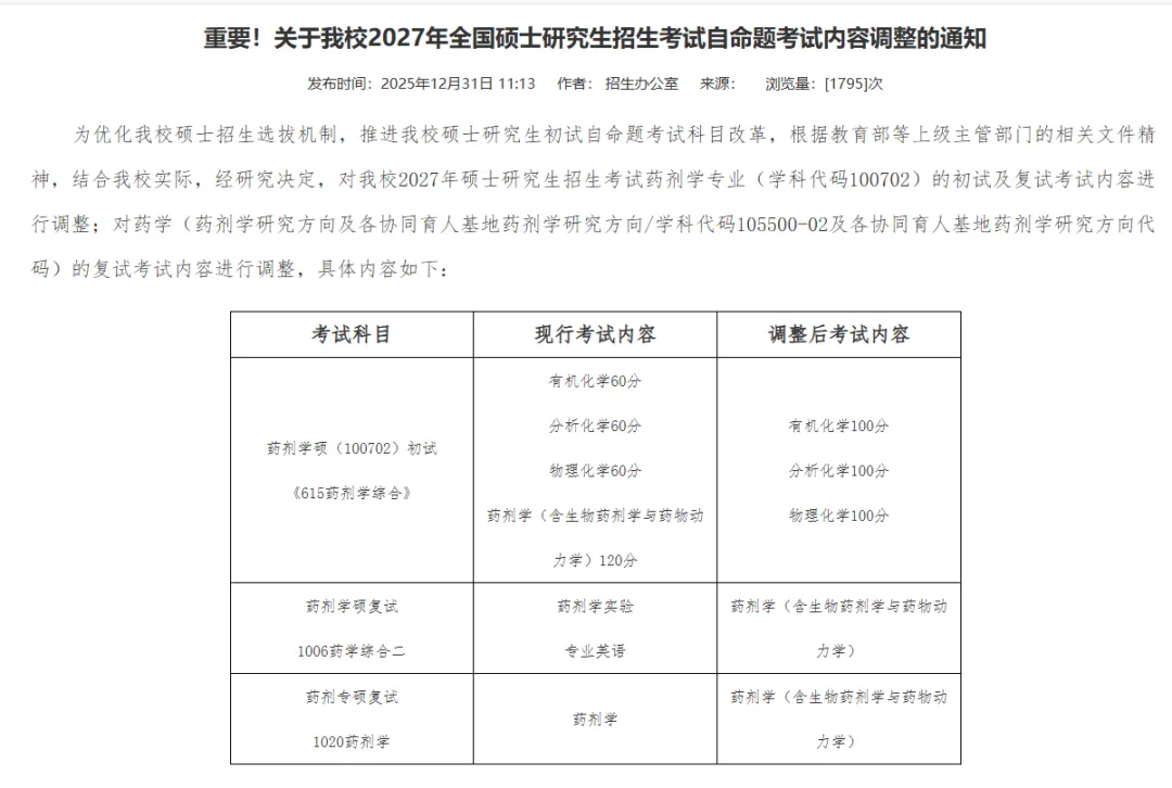 沈阳药科大学发布了关于我校2027年全国硕士研究生招生考试自命题考试内容调整的通知。对药剂学专业(学科代码100702)的初试及复试进行调整。