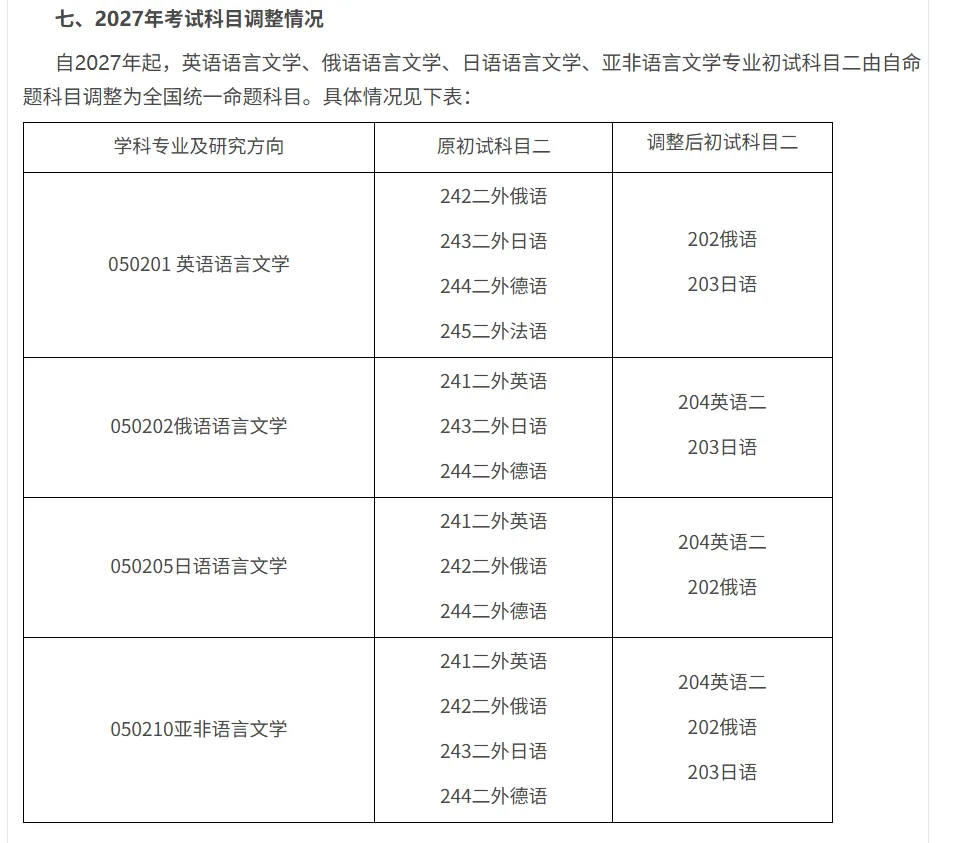 自2027年起,英语语言文学、俄语语言文学、日语语言文学、亚非语言文学专业初试科目二由自命题科目调整为全国统一命题科目。
