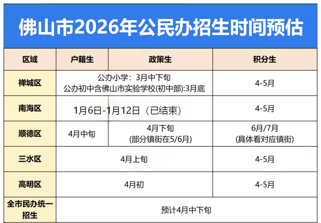根据南海区教育局2025年义务教育阶段学校招生工作安排,公办中小学户籍生报名预计将于4月初开始。