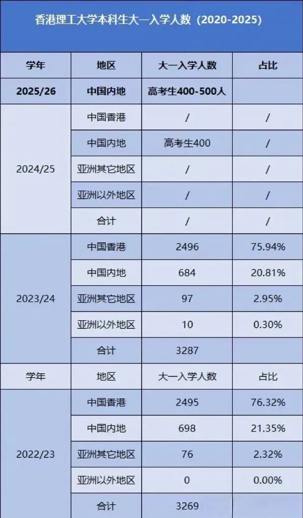 香港理工大学申请人数同样超过 2.1 万人,创历史新高,预计录取约 1200 人,生源覆盖内地、东南亚、中东及非洲地区。