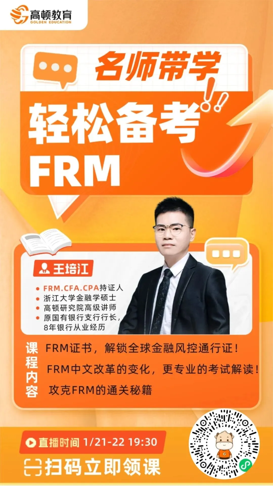 如果你正在考虑报名,或是对FRM还不太了解,这场直播会是个很好的机会,帮助你在早鸟价截止前,一次搞清楚FRM的考试体系、最新动态和行业趋势。