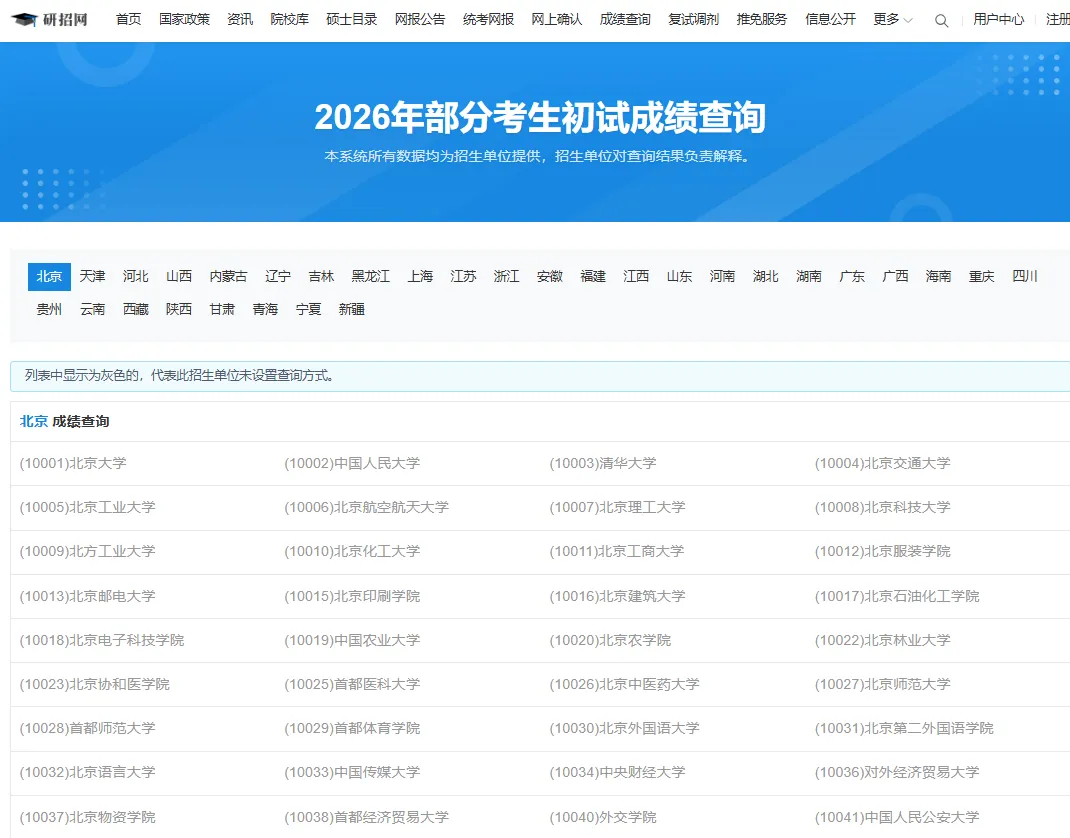 现在列表里的院校名称还都是灰色的,这说明对应招生单位暂未开放查分通道。等校名变成可点击的黑色,就意味着成绩要公布啦!到时大家选中目标院校,填好姓名、证件号和准考证号,就能查分了。