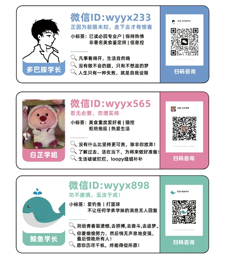 ps:如果不知道怎么写简历也别担心,【无崖复试辅导】有1v1直系指导修改,老师会带着你挖掘自己的亮点&避开坑点,交出一份赢得导师青睐的名片~