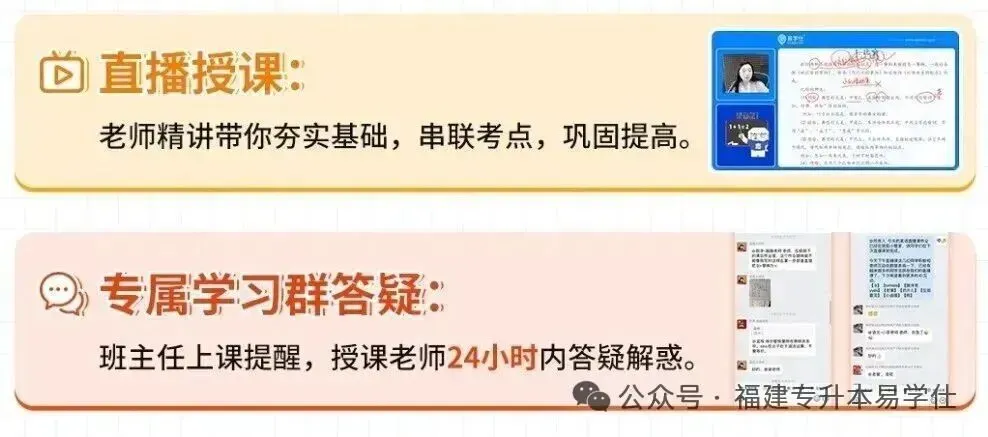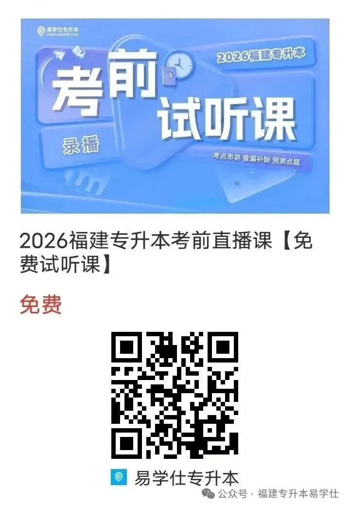 如果你觉得最后70天时间不够,备考没规划,学习不自律,可以试试2026年福建专升本考前冲刺直播课,考前两个月给你划重点,串讲各科目重难点,帮你梳理知识体系。还有班主任督学+课程答疑,解决拖延症!!