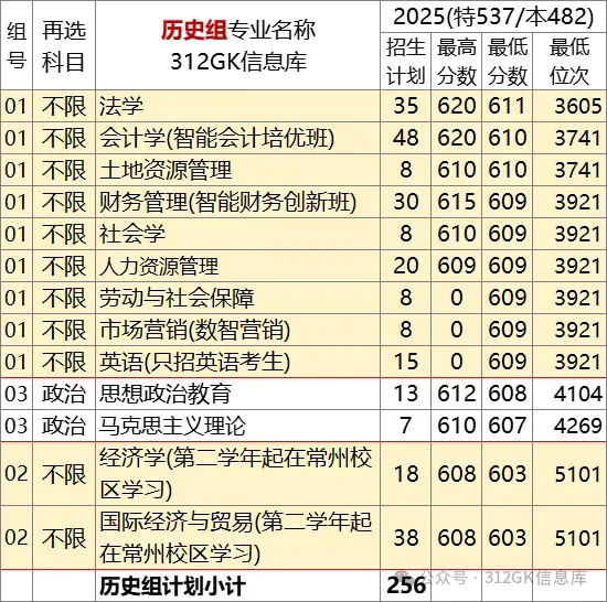 热门专业分数突出:法学、会计学(智能会计培优班)录取最低分分别为611分和610分,位居前列,反映其报考热度高。多数专业竞争均衡:人力资源管理、社会学、英语等专业最低分均为609分,最低位次集中在3921名左右,说明考生对这些专业的选择相对平均。选科与校区影响分数:要求“政治”科目的思想政治教育、马克思主义理论录取分稍低(607-608分);常州校区专业(经济学、国际经济与贸易)最低分为603分,略低于主校区专业,可能受校区地理位置影响。