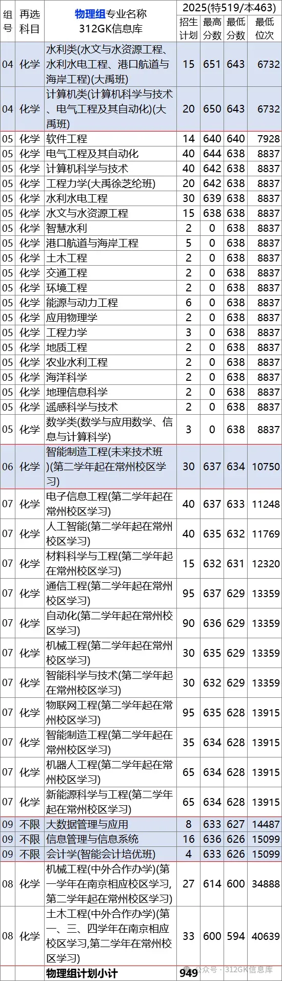 顶尖专业组(04组)分数领跑:要求选考化学的04组专业,包括“水利类(大禹班)”和“计算机类(大禹班)”,录取最低分均为643分,位列表格最高水平,是河海大学的王牌与热门方向,竞争最为激烈,适合高分尖子生报考。