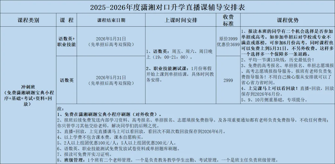 1、2025年9月份正式上课到2026年5月31日结课。9月份开始每周五、周六、周日晚上19:00-21:00.上课,月考时间另外安排通知;报班的同学有二个选择可参加单招或高考。参加单招的同学上课到3月中单招考试前结课;参加高考的同学上课到5月31日结束。