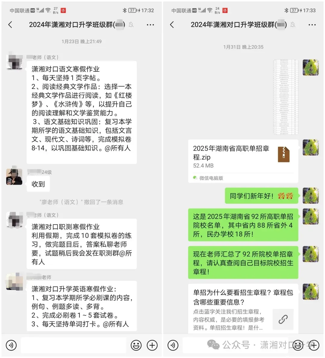 潇湘对口升学有班主任专人负责,从学生报名入学、安排上课、上课的课堂管理、作业管理、考试、高考报名指导、单招报名指导、学习资料发放等等都有专业的班主任进行管理。