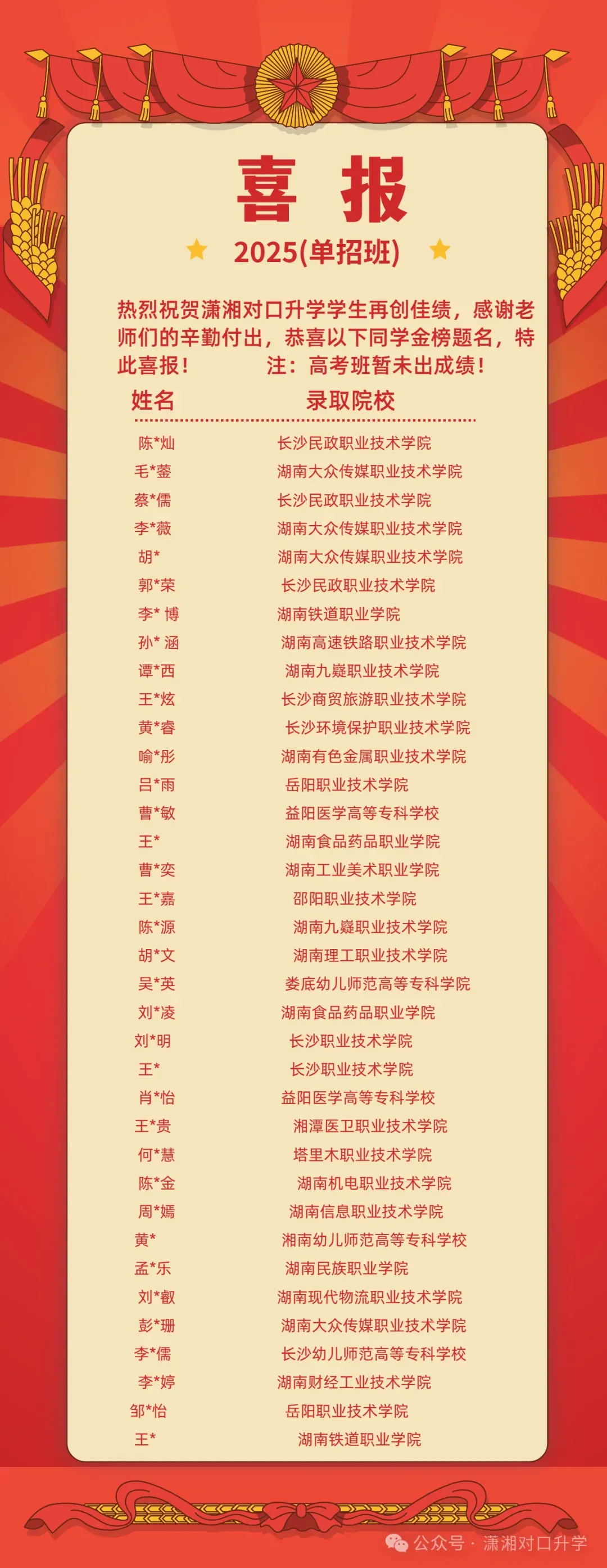 潇湘对口升学在教学过程当中,不但有学、教、读、背、练、等教学方式,还提供大量的资料给学生练习、每个月进行一次摸底月考、课后布置作业;才取得这么优异的成绩,2025年单招班公办院校录取比率达到95%以上,参加对口高考、单招总录取率保持在98.5%以上。