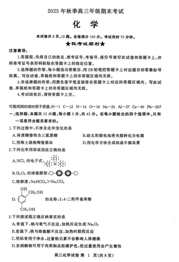 >黄冈市2025年秋季高三年级1月期末考试化学