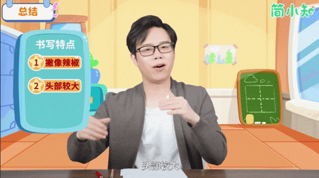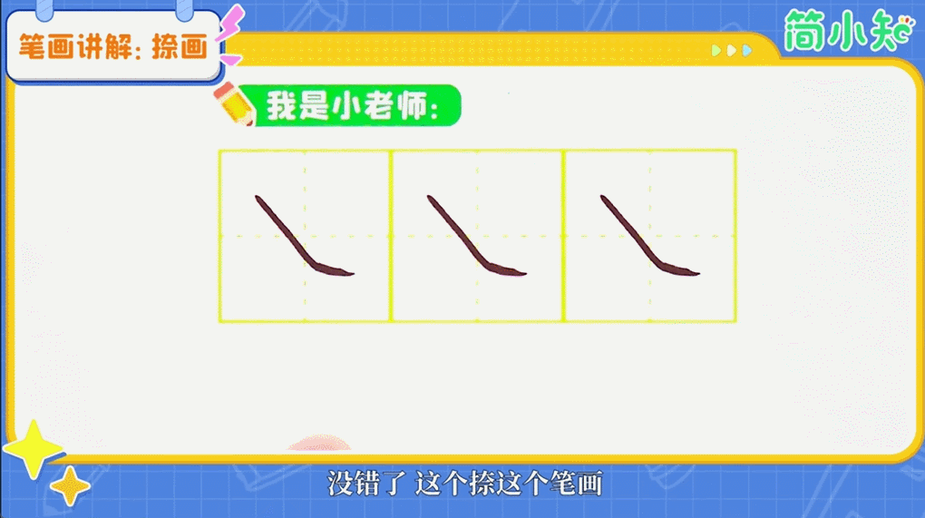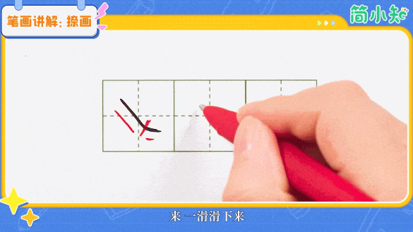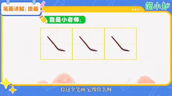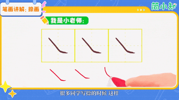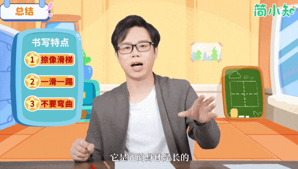 王老师还会用简单好记忆的4字口诀:“捺像滑梯、一滑一梯、不要弯曲”,让孩子轻松理解“捺”的特点。我相信很多家长应该跟我一样,写了几十年字,第一次知道原来撇不是弯的,而是直的!!omg!