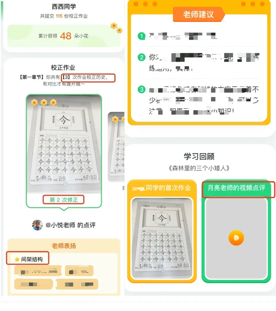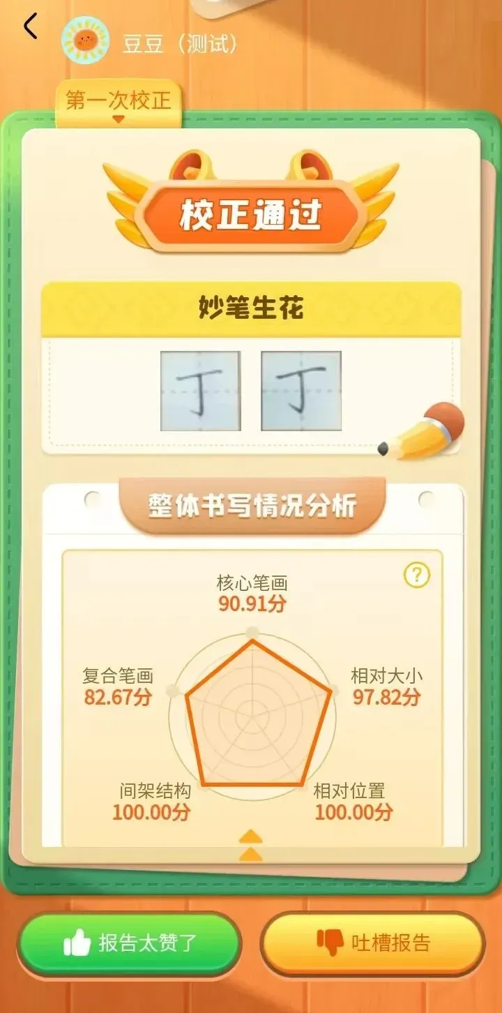 示范完后,再进一步给娃总结书写要点,帮助娃加深理解。讲解总结之后,立马就能让孩子随堂跟练,课程里面植入了AI智能,能够随时检测到孩子书写情况,及时巩固。最后结束还有AI交互小游戏,检验娃对知识点掌握的情况,进一步巩固知识点。既让孩子掌握了当天知识,还产生了兴趣,主动爱上写字!15分钟的课堂里,穿插进行三次精讲、三次练习,动静结合(理论和书写相结合),娃不会觉得枯燥,学习掌握速度也会更快!