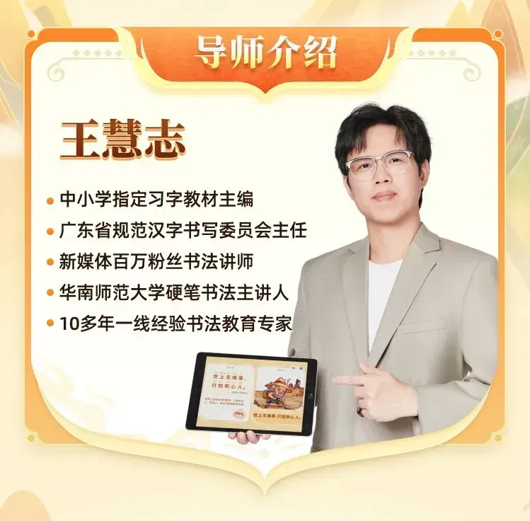 课程视频还能无限回放!如果是二胎家庭,纯纯薅羊毛了~低龄孩子跟着练,激发书写兴趣,练字频率短,充分调动兴趣,从小养成写字好习惯。不仅会生成专属的学习报告,每次练字作业老师都会实时1v1点评指导,有错及时纠正,孩子进步快。注意:报名时间有限,请抓紧时间扫描下方对应年级的二维码,提前抢占学习名额。在这门课里,王慧志老师将帮孩子学习: