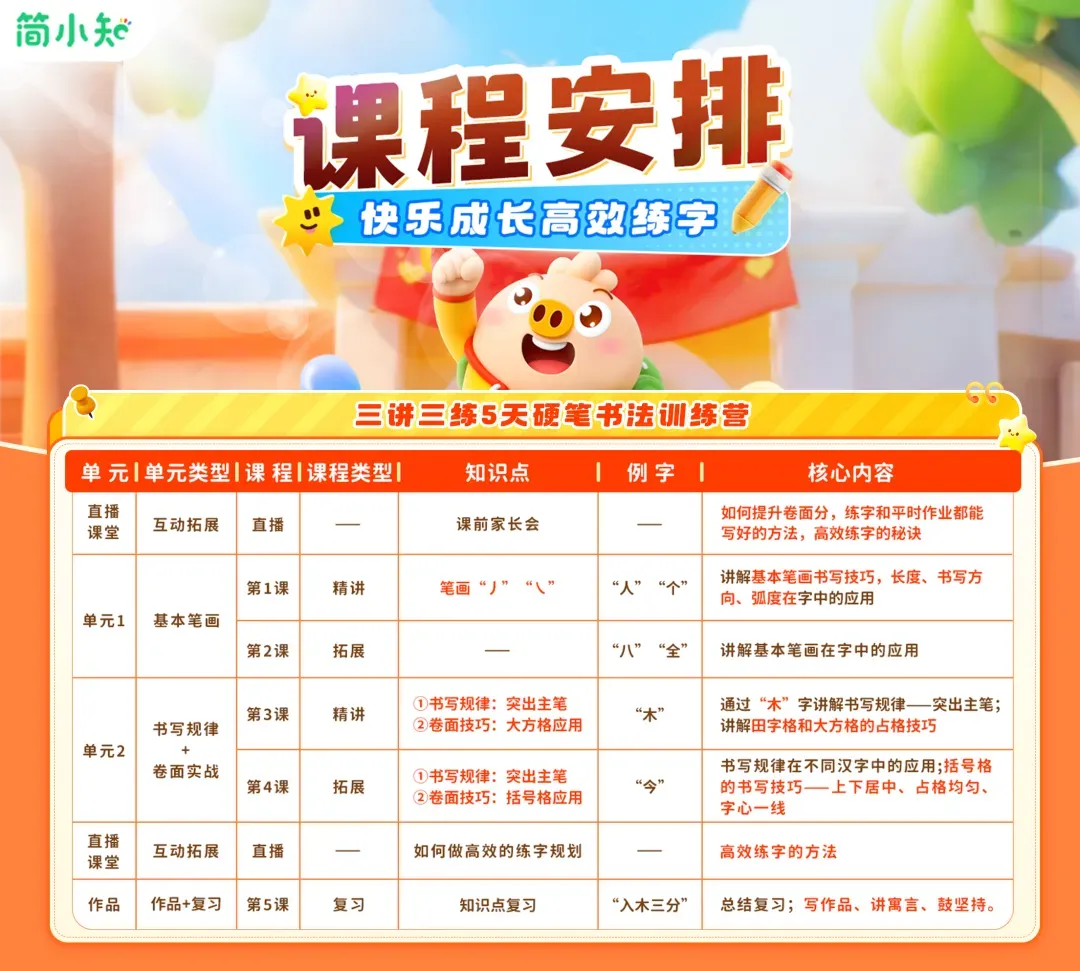 为帮助孩子速成好字,5天改善字丑潦草乱,现免费开通中小学【全国写字训练营】。让孩子养成正确握笔姿势,速成一手端正好字,提高卷面分!做到无需苦练字帖,不必周末折腾跑线下班,省时省力省钱不费妈!在家就能轻松练好字。🔥全程线上教学+1v1真人点评(中小学指定习字教材主编亲授)简小知5天写字课特训营