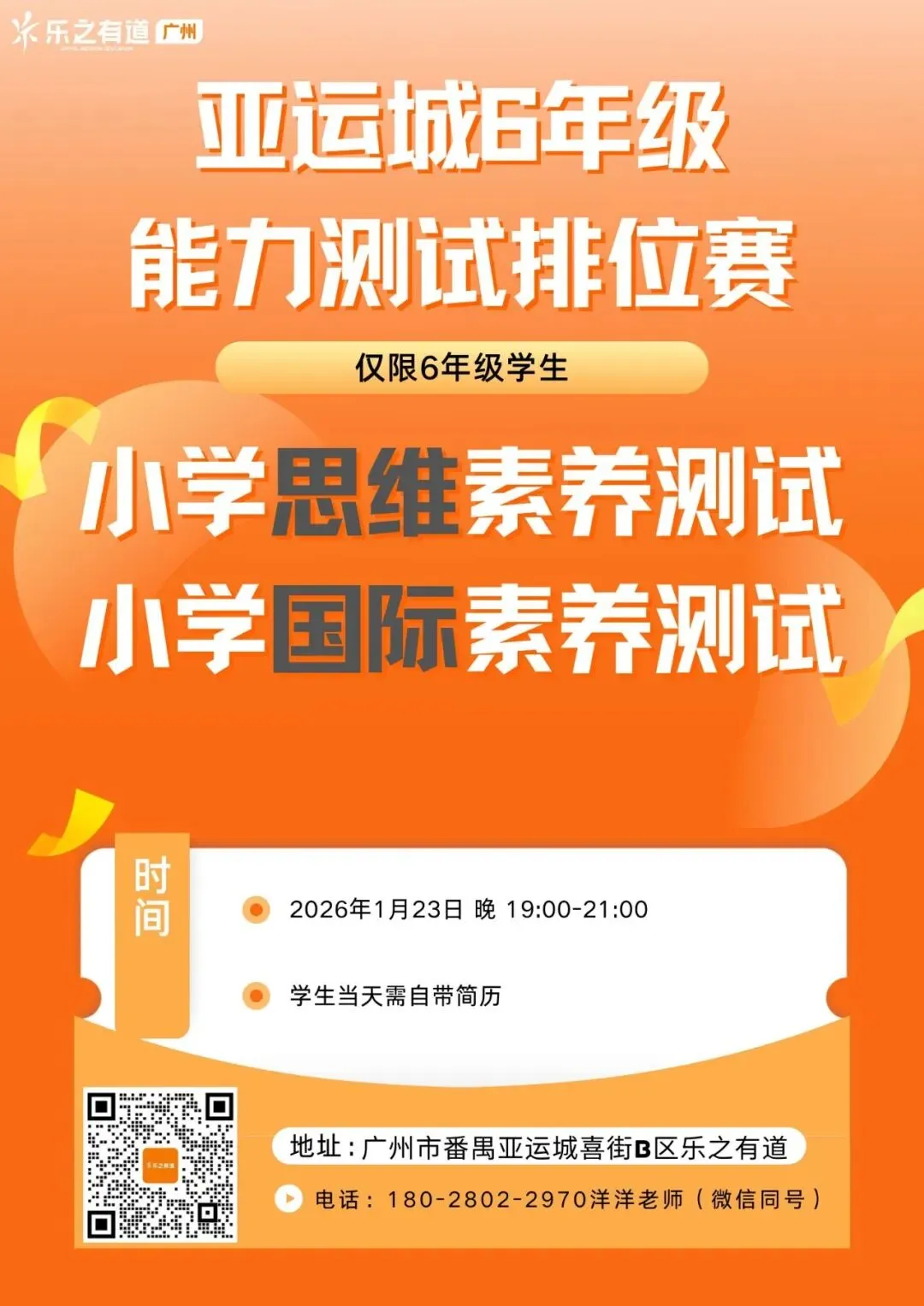 小升初是学业重要转折点。在政策明确、路径清晰的今天,提前规划、精准定位尤为重要。2026年亚运城六年级能力测评排位赛报名已开启。因场地与评估资源有限,仅开放200个名额。乐之有道广州校区