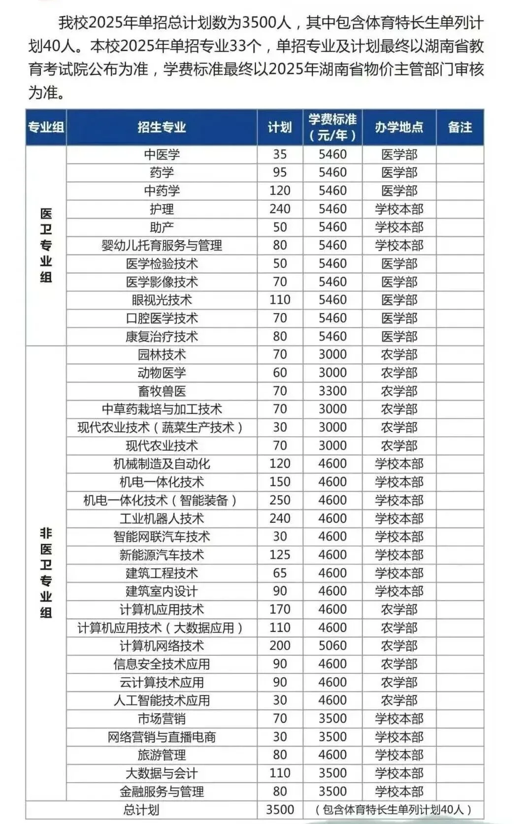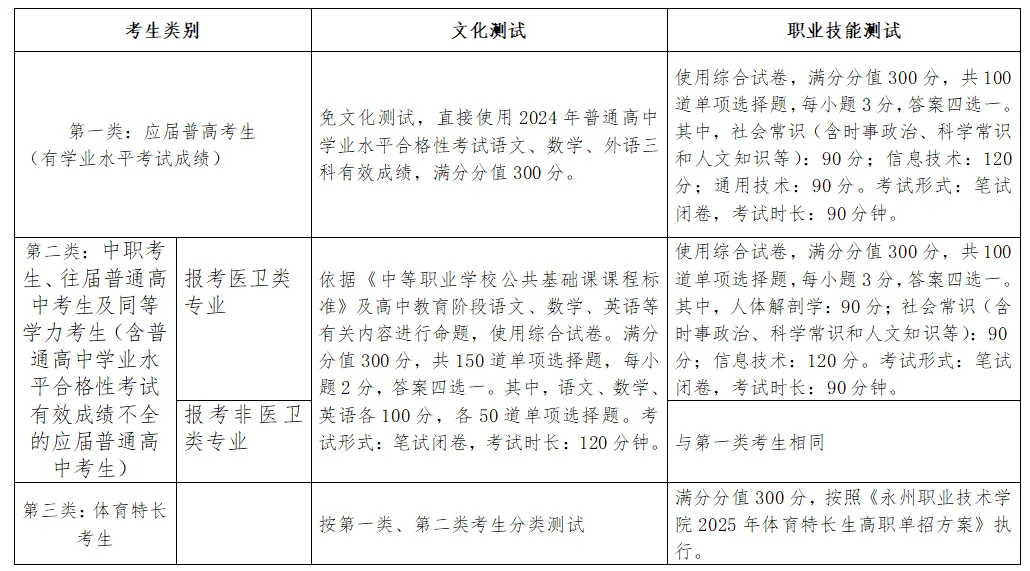 3.第三类:体育特长生。文化素质测试根据学生类别不同,分别采取上述第一类或第二类的方式进行。职业技能测试成绩以体育专项测试成绩代替,专项测试按照《永州职业技术学院2025年体育特长生高职单招方案》执行。考生的综合成绩为文化素质成绩(300分)+职业技能成绩(300分)。高职单招综合成绩(总成绩)满分为600分,文化素质成绩与职业技能成绩占比为1:1。